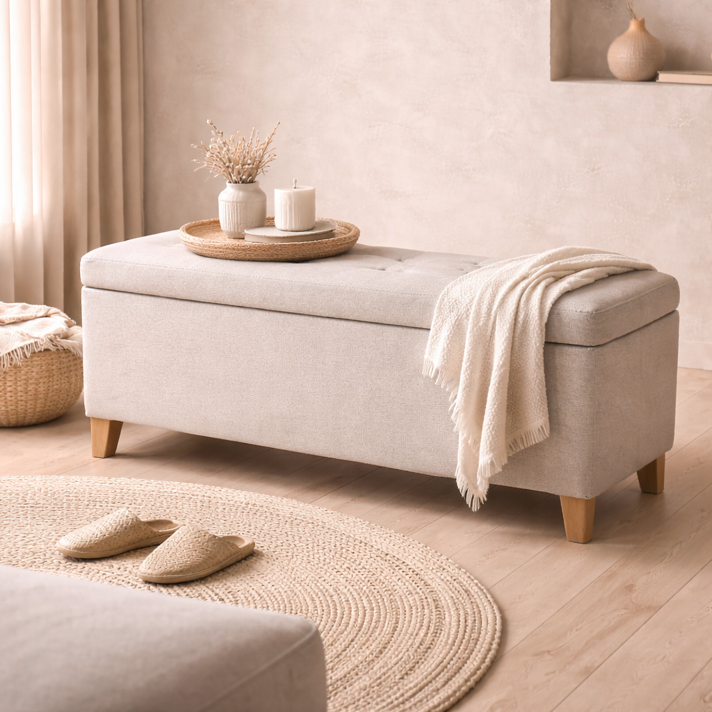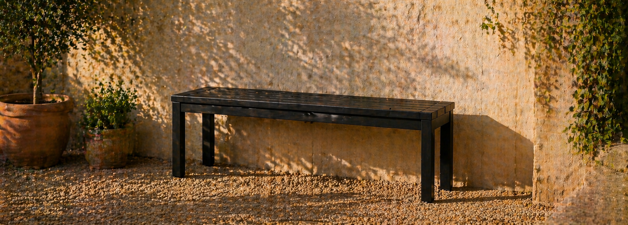 Seduta lineare utilizzabile in ingressi, soggiorni o spazi esterni, progettata per uso quotidiano