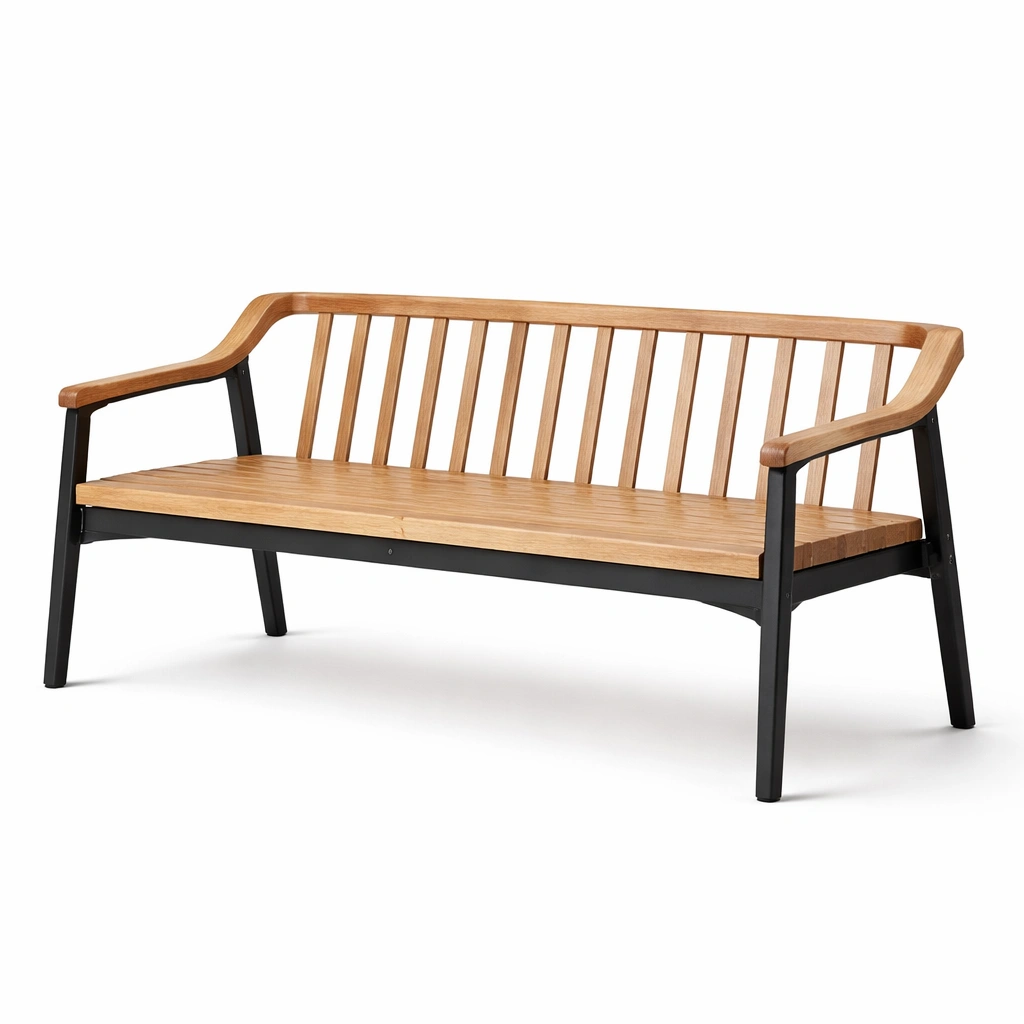 Panca in legno massello e acciaio con braccioli