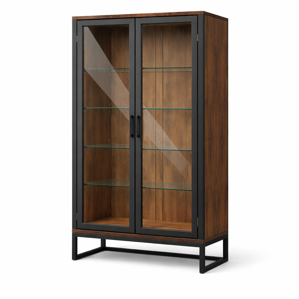 Vetrina in legno di noce con ante in vetro temperato e metallo nero