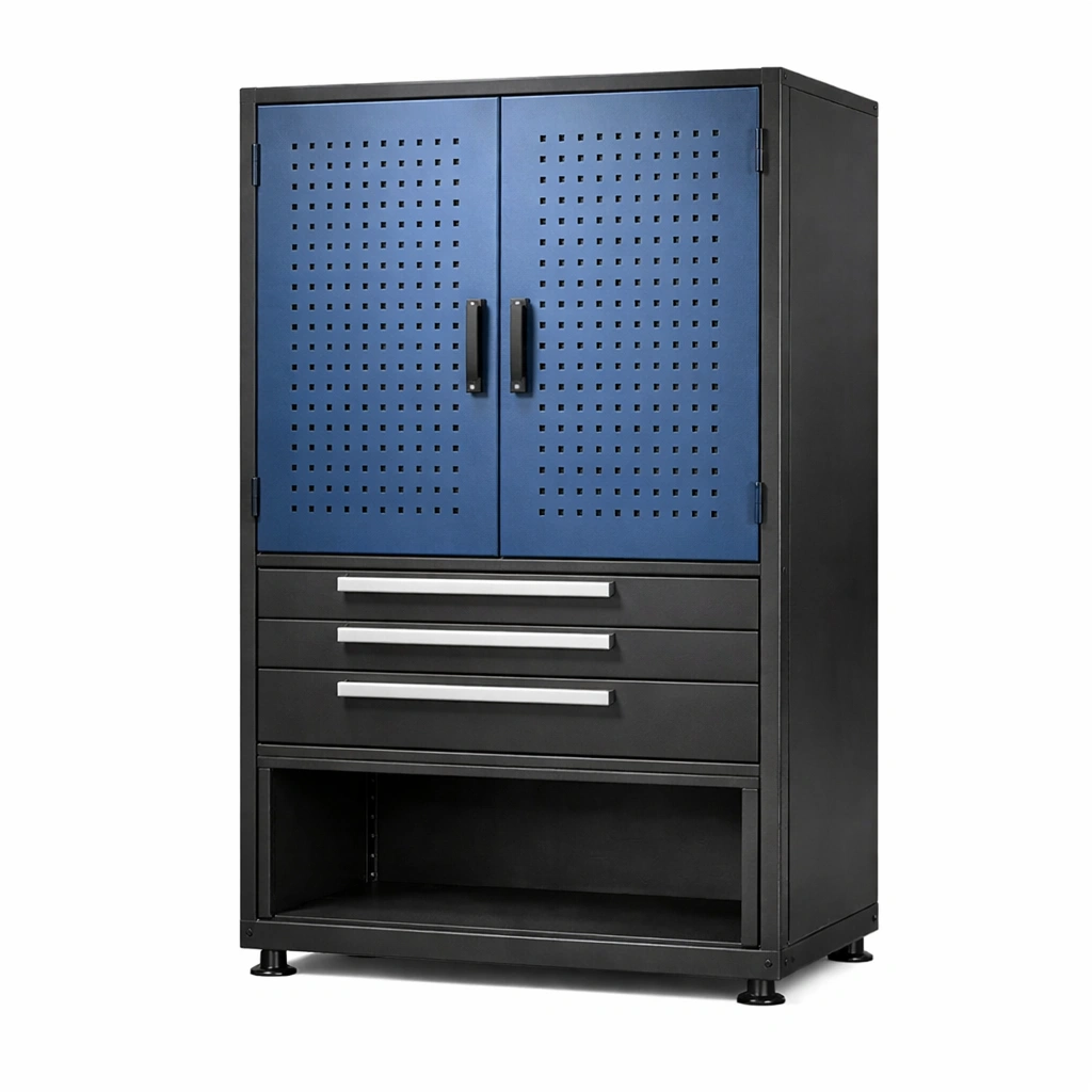 L'armadio è realizzato in acciaio rivestito a polvere. Le ante blu sono forate per la ventilazione. Include tre cassetti e uno spazio aperto inferiore. Dimensioni: altezza 180 cm, larghezza 90 cm, profondità 45 cm. Capacità di carico massima: 100 kg.