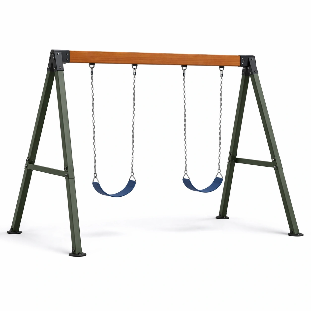 L'altalena doppia presenta una struttura in acciaio verniciato a polvere, con sedili in polietilene blu ad alta densità.